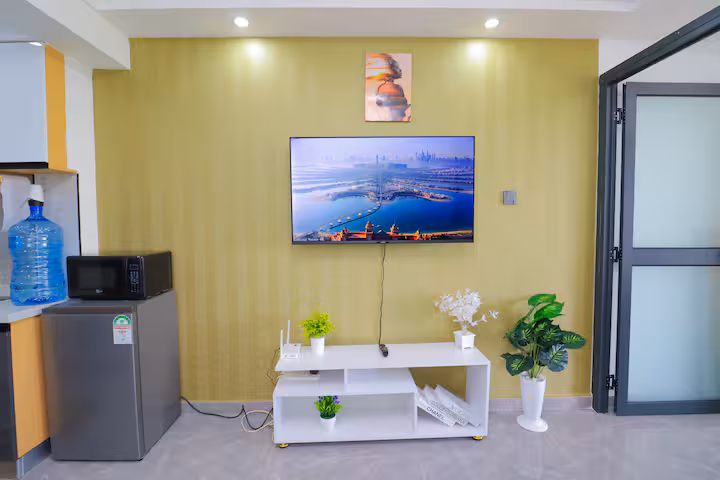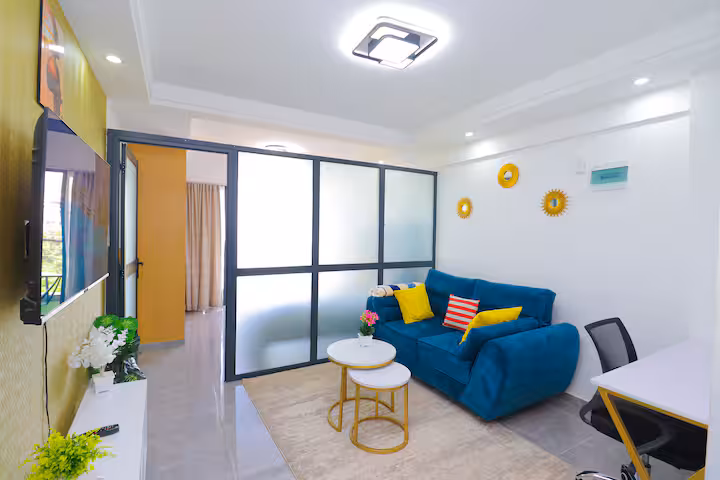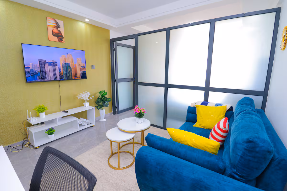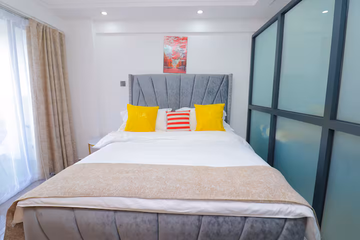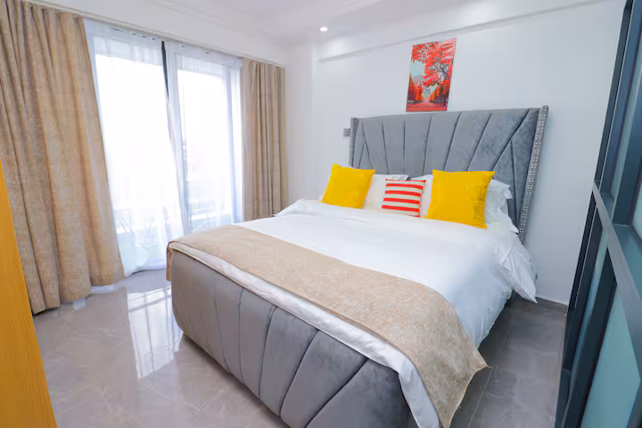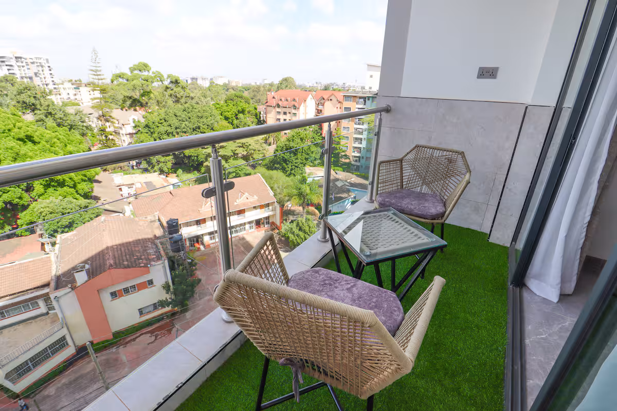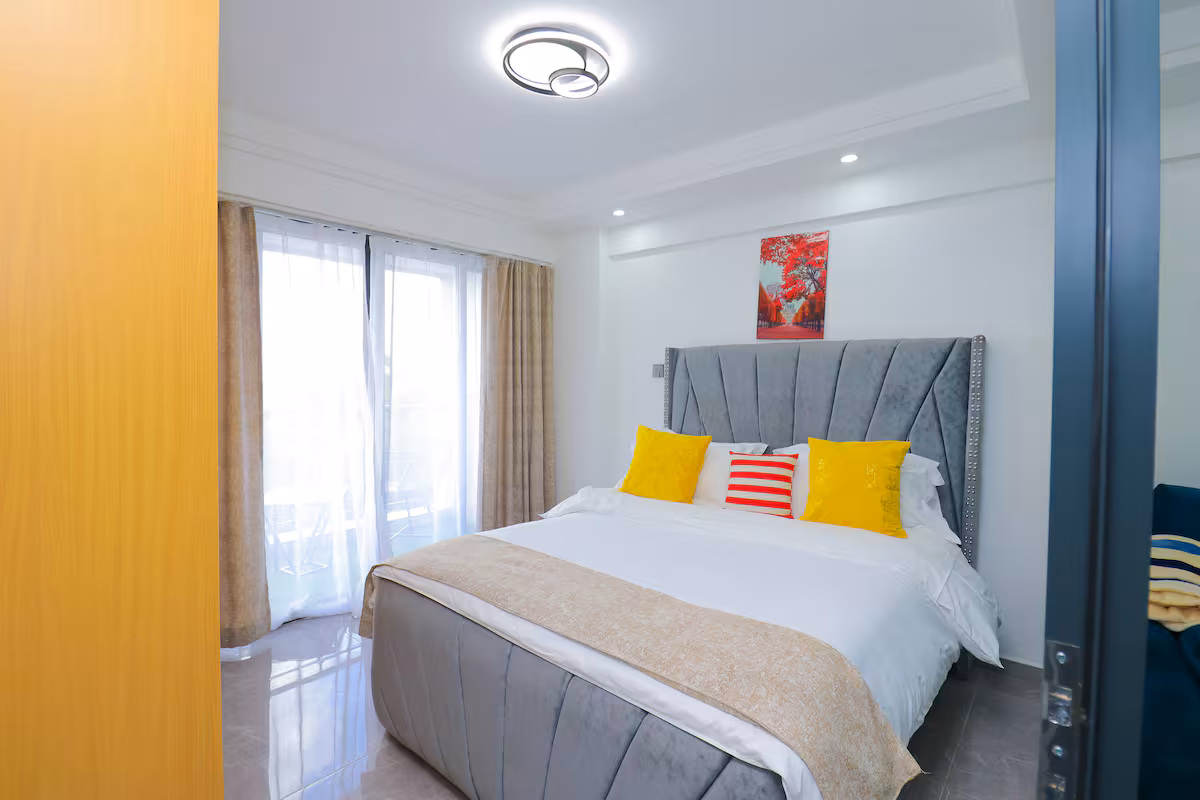 A modern one-bedroom apartment with sweeping skyline views of Kilimani. Perfect for business or leisure, featuring a queen bed, 50″ UHD TV, and a fully equipped kitchen. Enjoy the calm of a secure home with rooftop access, gym, and free parking.