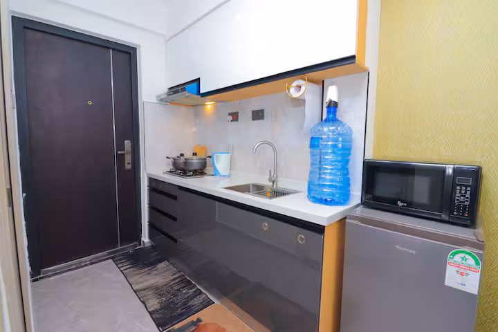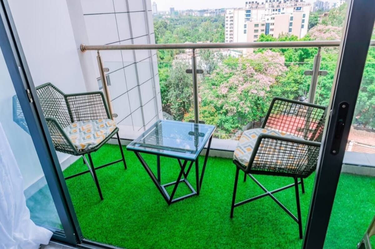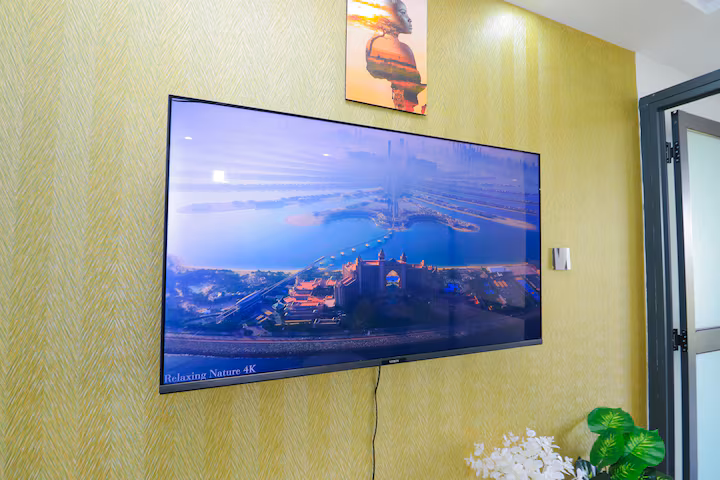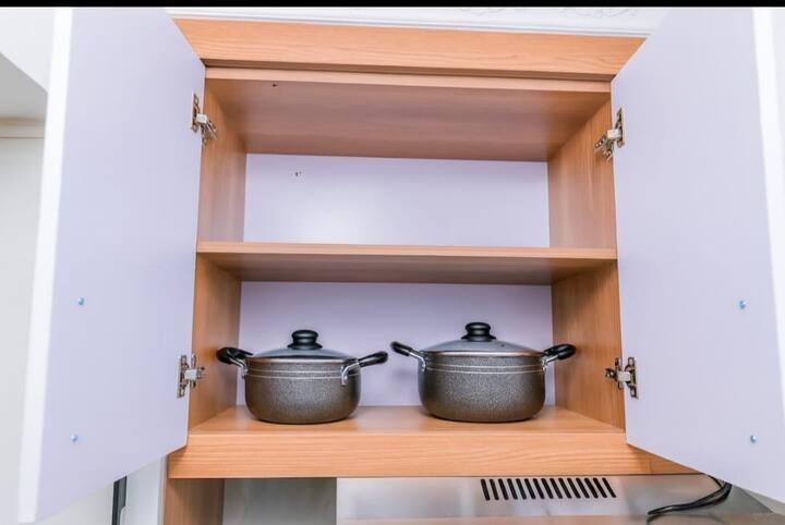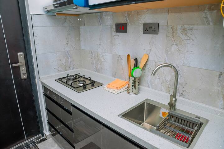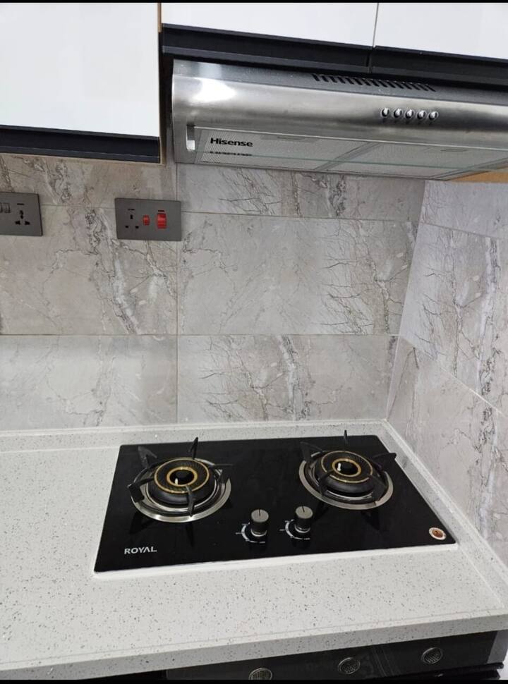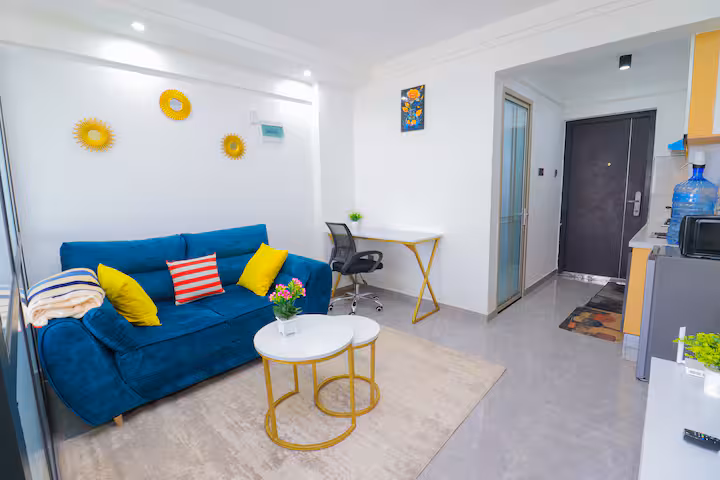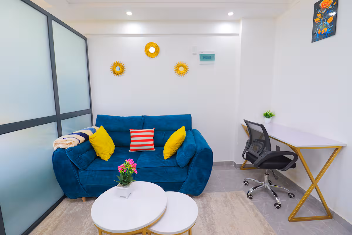 A modern one-bedroom apartment with sweeping skyline views of Kilimani. Perfect for business or leisure, featuring a queen bed, 50″ UHD TV, and a fully equipped kitchen. Enjoy the calm of a secure home with rooftop access, gym, and free parking.