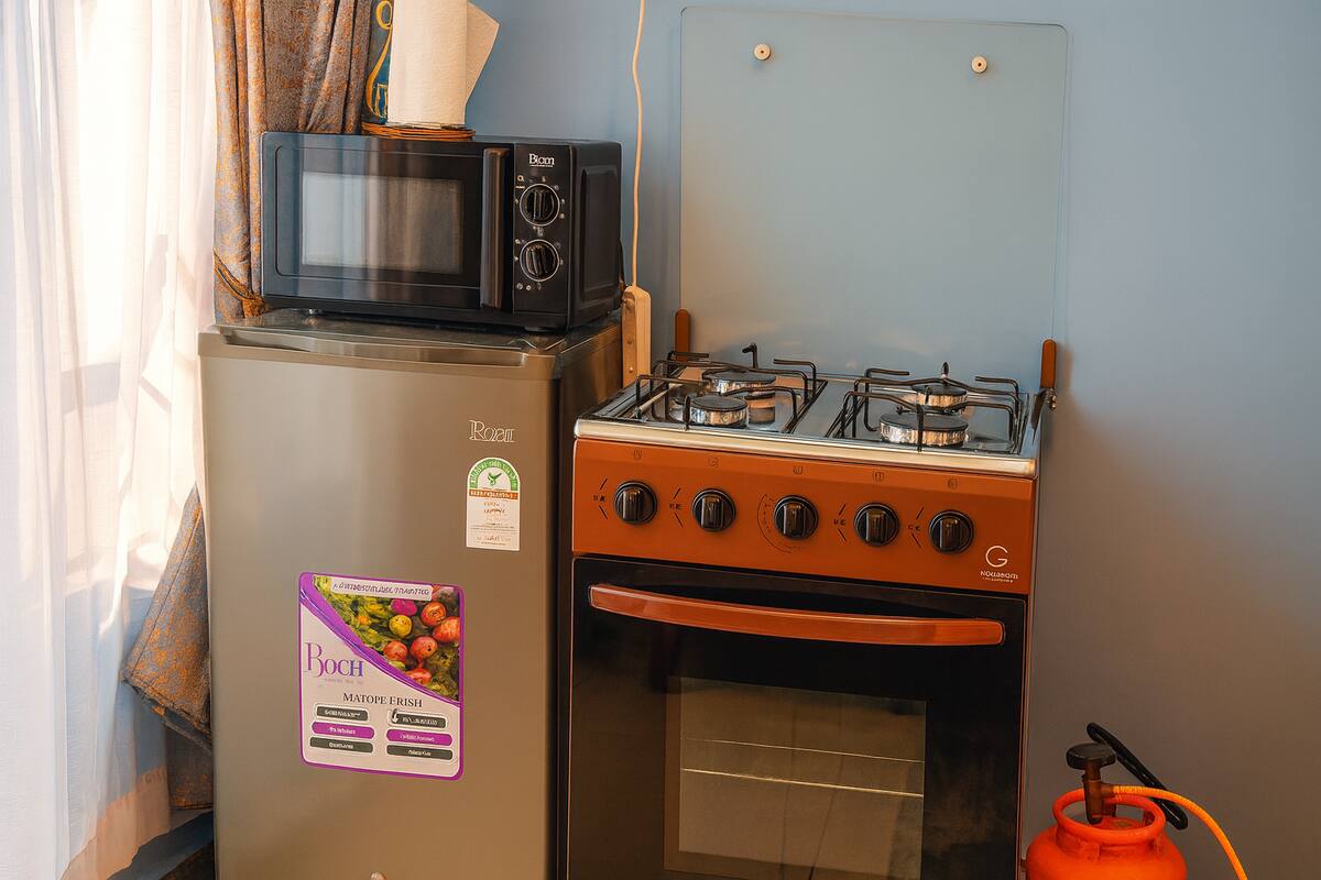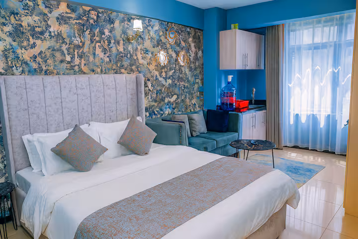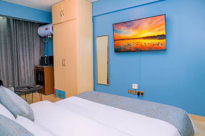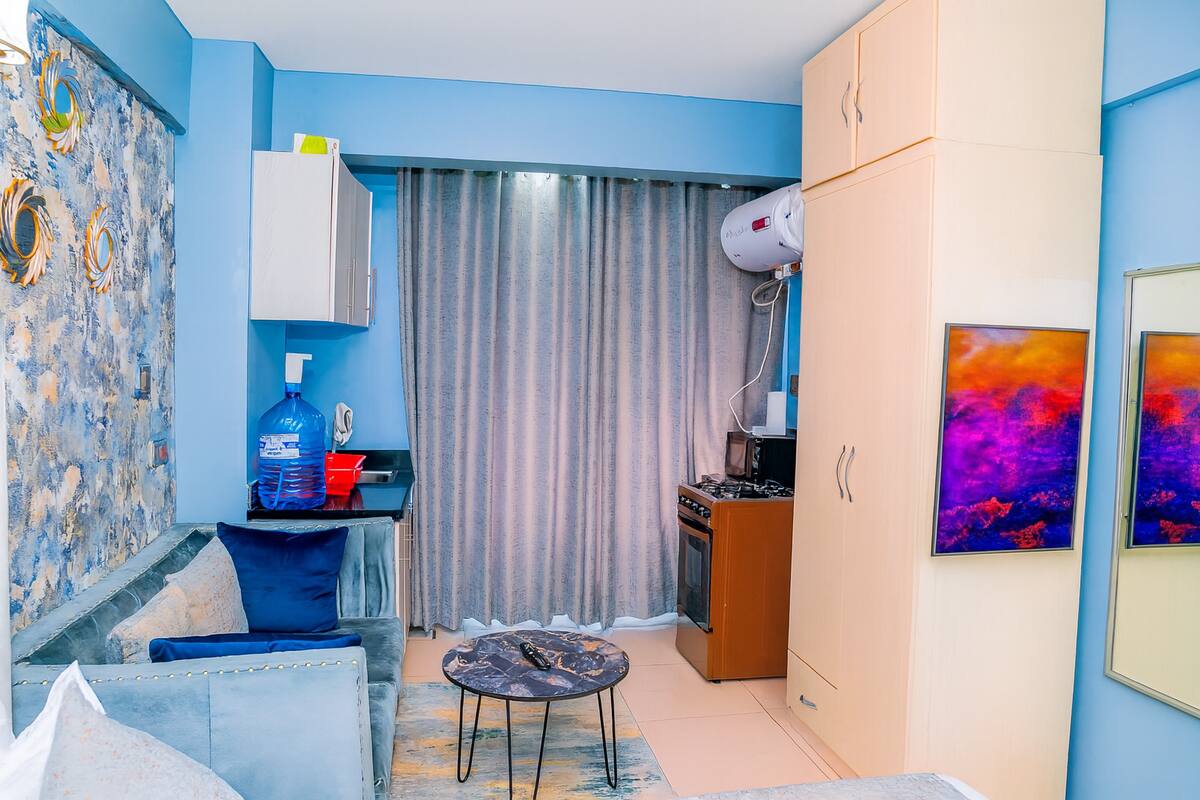 A cozy and stylish studio with modern comforts. Enjoy a queen bed, 55″ UHD TV, and a fully equipped kitchen. With rooftop views, free parking, and 24/7 security, this space is perfect for a peaceful city escape.